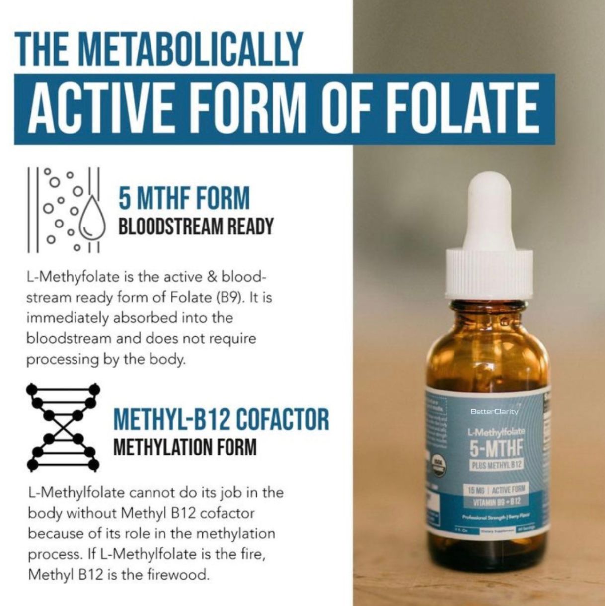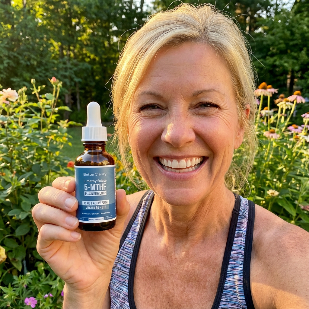 BetterClarity provides 5-MTHF, the active form of folate, along with methyl B12—two essential nutrients your body uses in key metabolic pathways. Unlike standard folic acid, 5-MTHF is already activated, making it easier for your body to recognize and utilize. This supports mental clarity, steady energy, and overall balance, especially for individuals who don’t respond well to regular B vitamins.